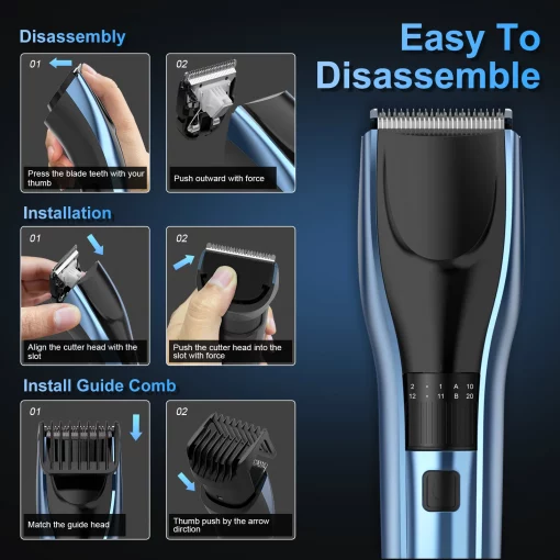Our hair clippers for men set the gold standard in grooming tools. Featuring a detachable blade mechanism, it comes with two replacement blades, ensuring you’re always ready for action. No more blunt cuts or dragging – with our sharp, easily interchangeable blades, you’re guaranteed a clean cut every single time.