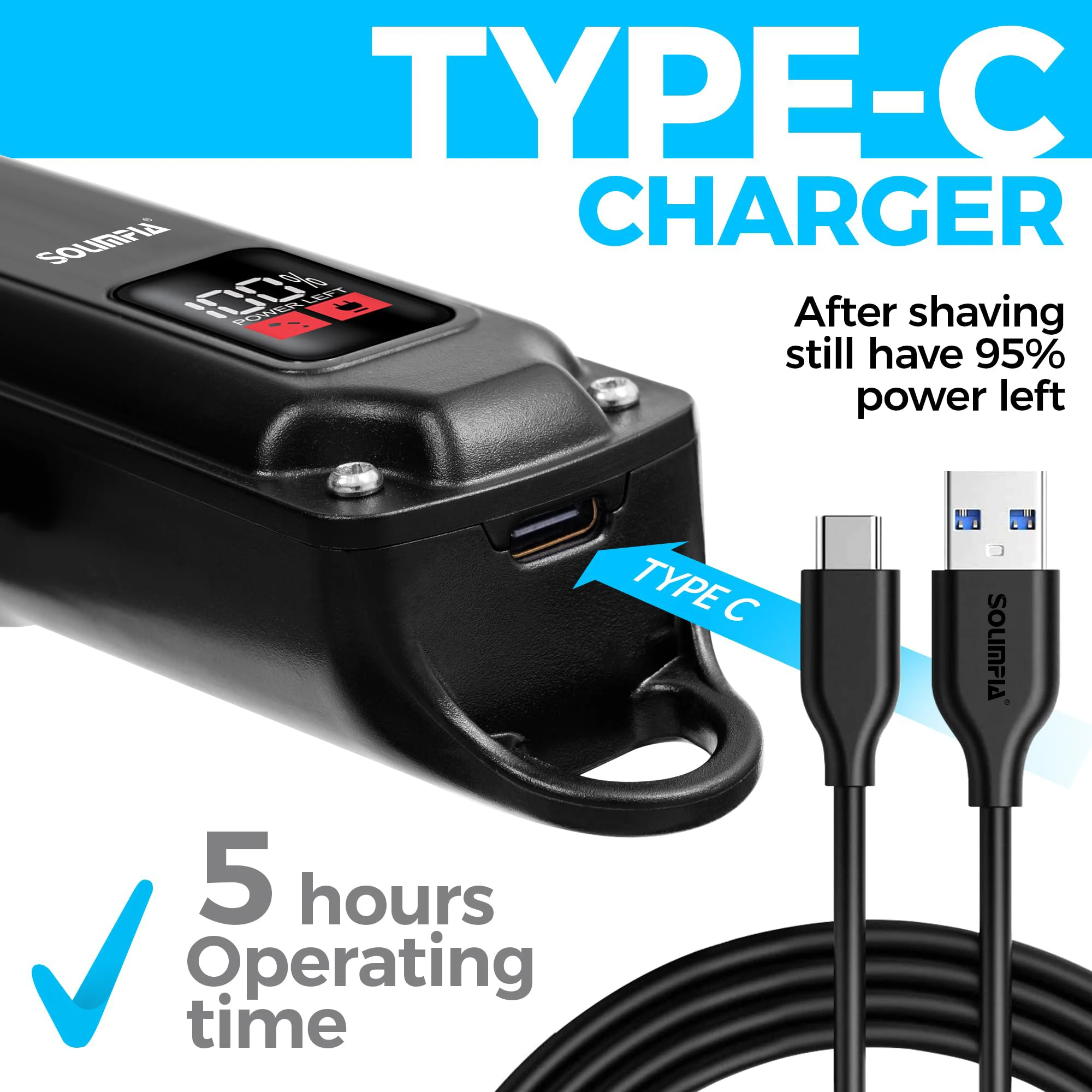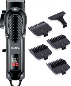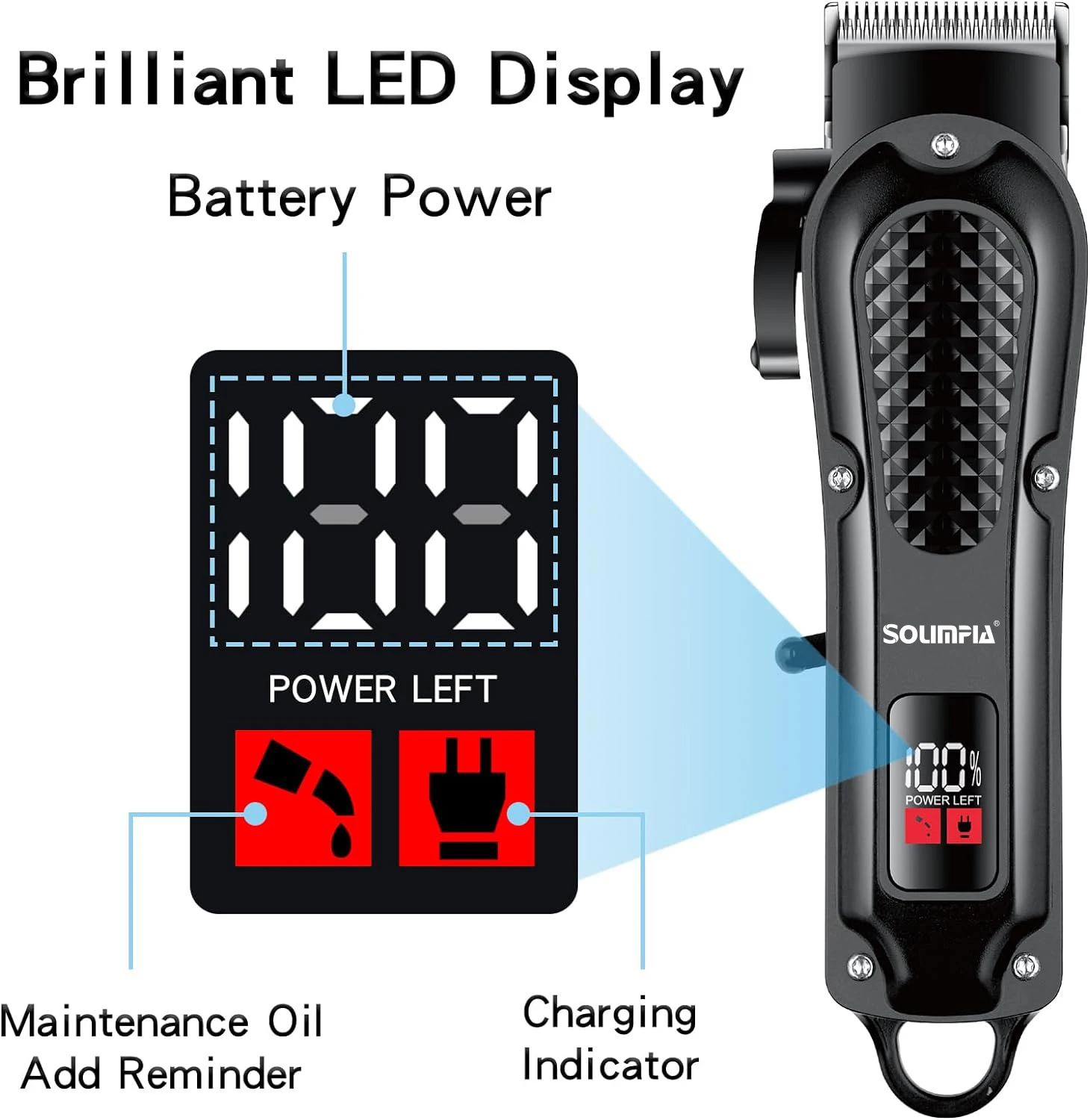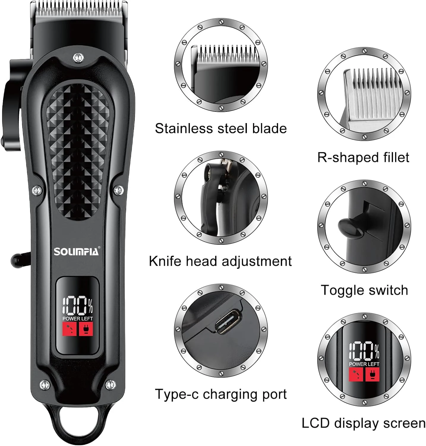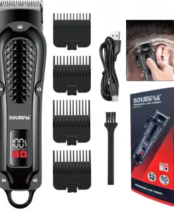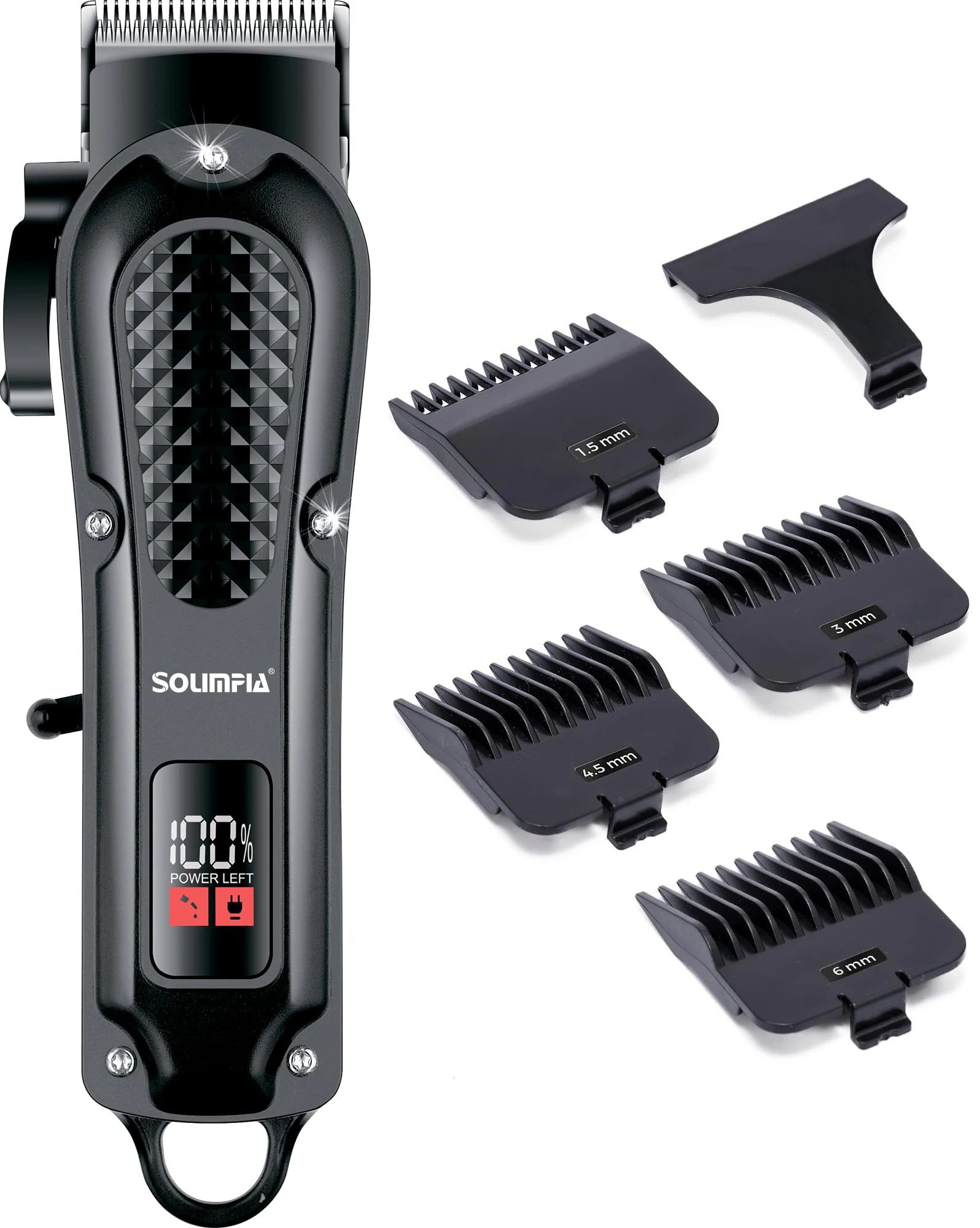 SOLIMPIA cordless hair trimmer. USB rechargeable, LED display, ceramic blade, 4 guide combs, waterproof, and skin-safe.